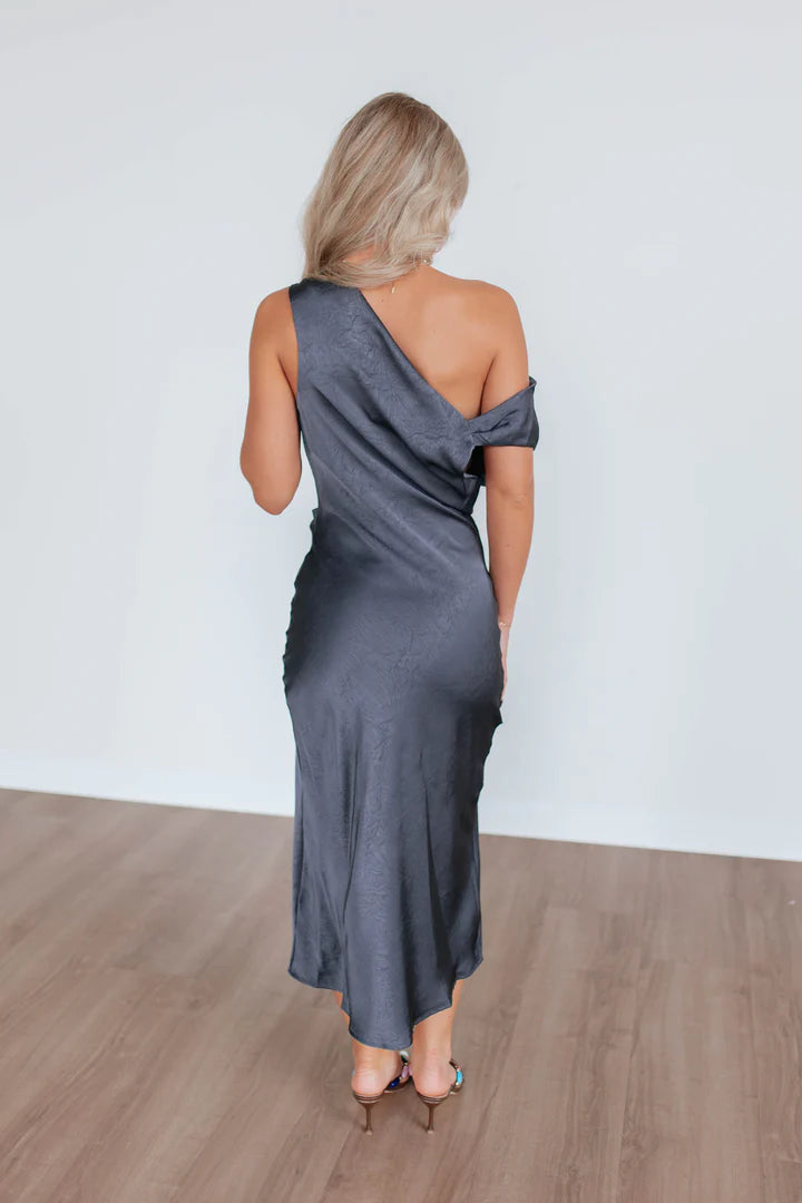 Statement Hardware Accent: A polished, multi-ring embellishment secures the shoulder drape, serving as a bold focal point that elevates the dress’s upscale feel.