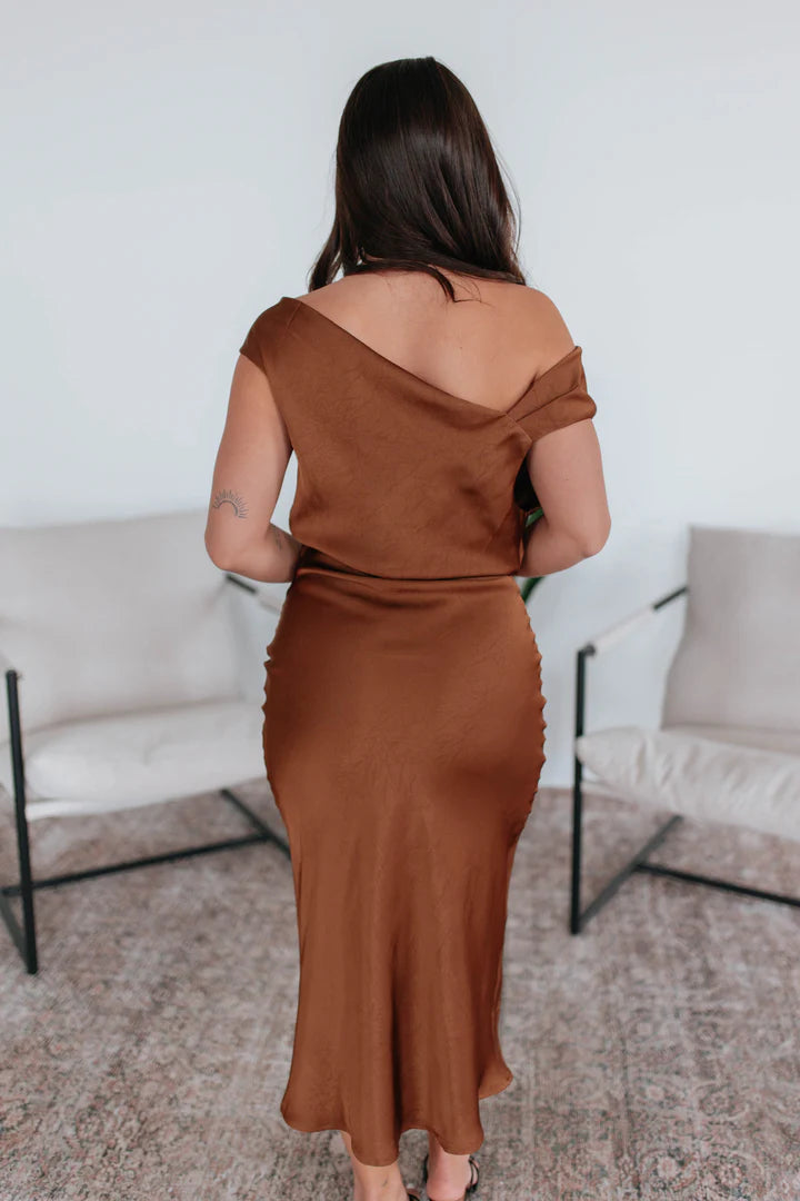 Chic Asymmetrical Neckline: The off-the-shoulder, draped design adds a romantic, modern edge while framing the collarbone for a flattering silhouette.